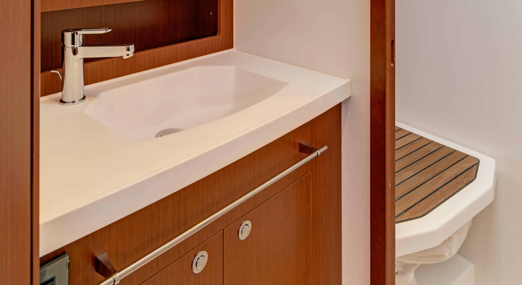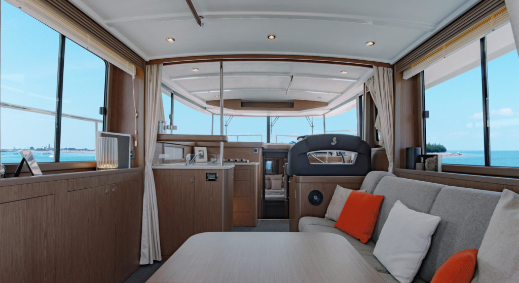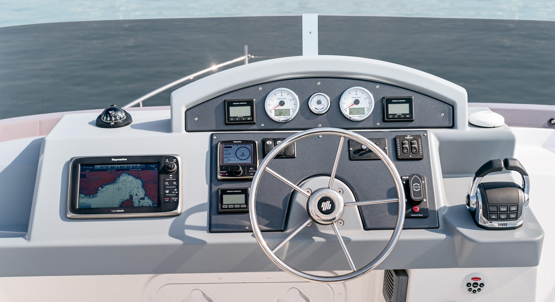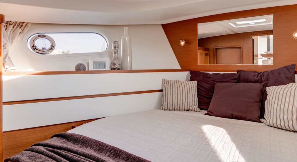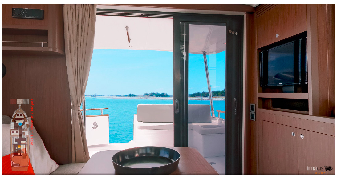 Große Rumpfluken durchfluten die Kabinen mit Licht. Das ausziehbare Sofa mit Trennvorhang ermöglicht, in einigen Sekunden, den Salon als dritte Kabine privatisieren Das große Cockpit ist ein echter Wohnraum, der mit einer Schutztür vor Wind geschützt werden kann.