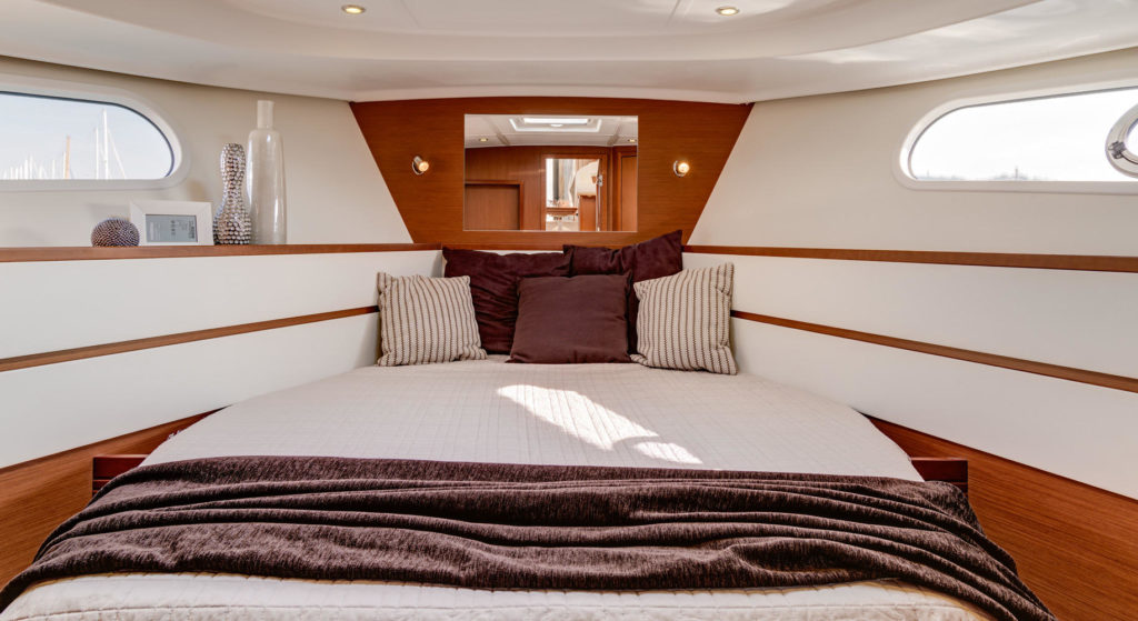 Konzipiert, um das bewohnbare Volumen zu maximieren, das Innere des Swift Trawlers 44 schlägt ein allgegenwärtiges Licht vor, Adaptionen mit mehreren Funktionen und zahlreichen Stauräumen. Kabinen sehen aus wie Zimmer, das wandelbare sofa verwandelt die badewanne in wenigen sekunden in eine gästekabine. Ergonomisches Cockpit und blendfreie Windschutzscheibe erhöhen die Sicherheit beim Bootfahren. Sowohl klassisch als auch zeitgenössisch, Mahagoni-Holzvertäfelungen sorgen für eine warme Atmosphäre.