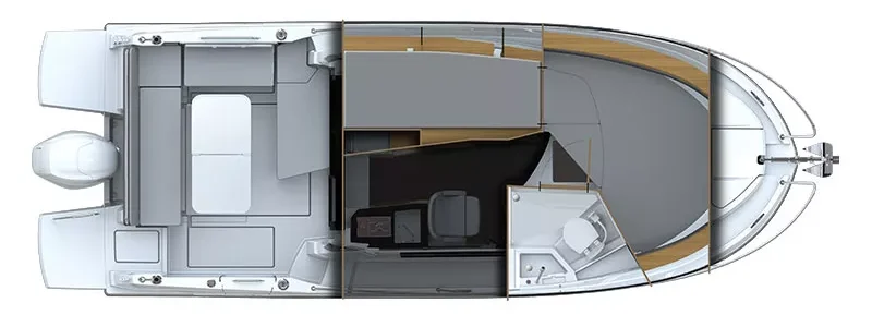 The aft bench is replaced by a fishing station equipped with professional quality rod holders. In addition to the nursery with water circulation, three stowage compartments are arranged under the deck, one of which can hold a fish bucket.