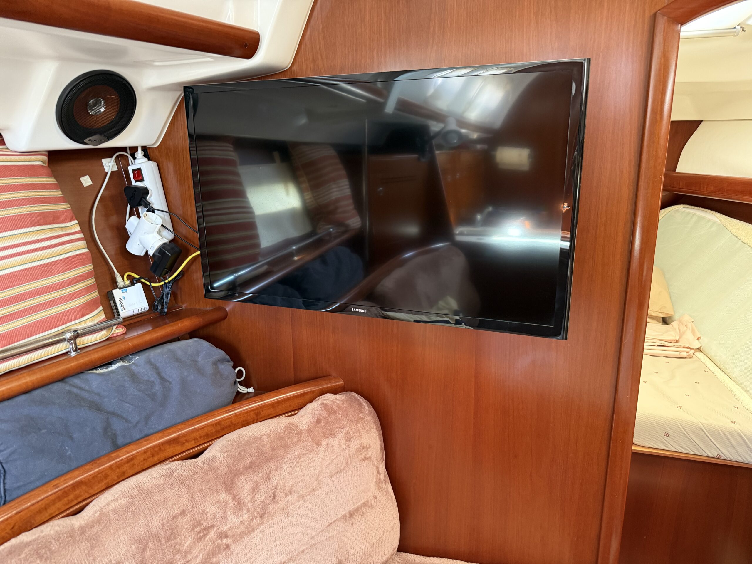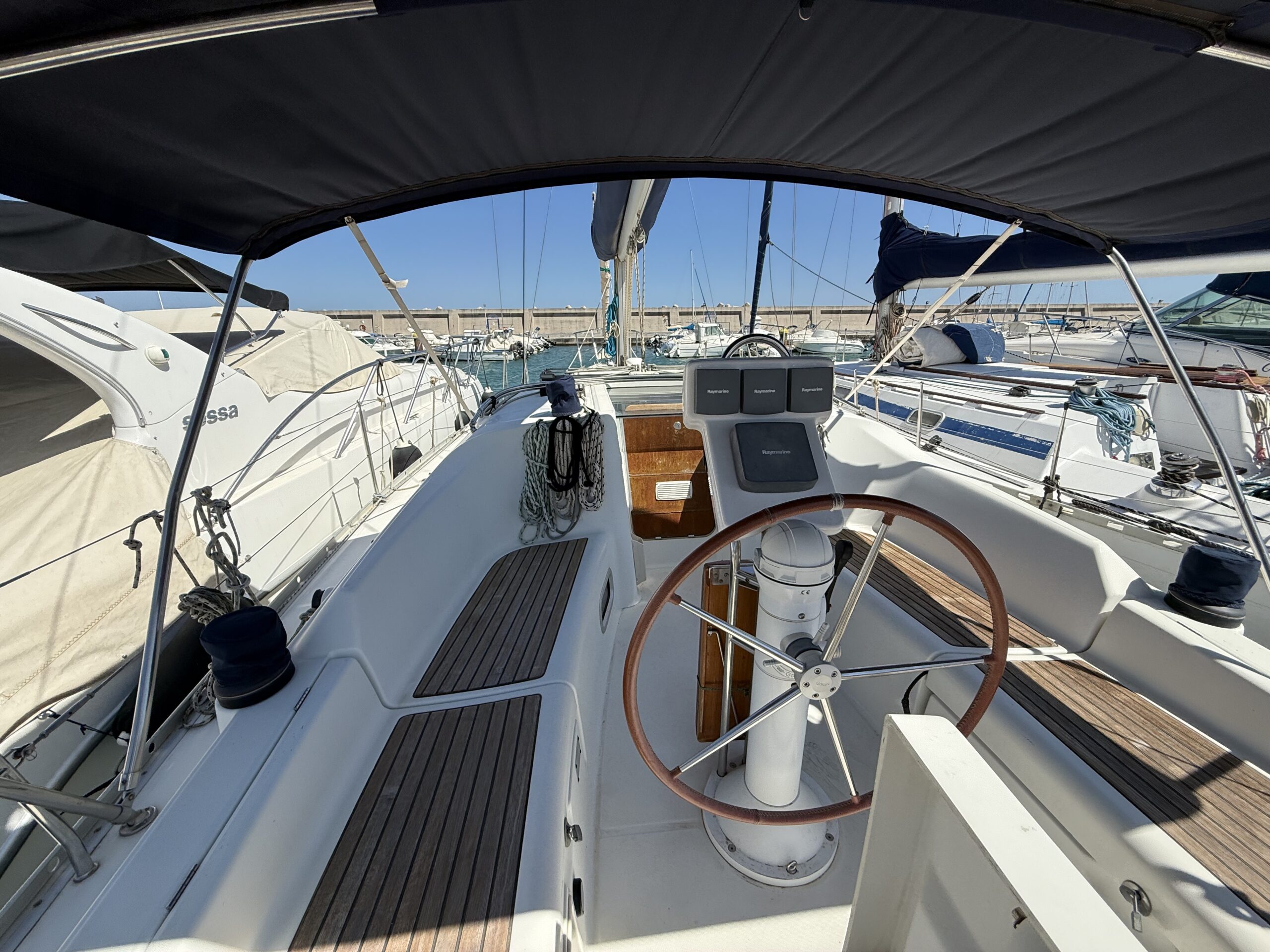 Cette unité se distingue par son équipement de navigation complet Raymarine, qui comprend le pilote automatique, tridonnées, équipement éolien, à la fin, curseur et radio VHF, assurer un contrôle précis et sûr pendant la navigation. L'ensemble du système est pensé pour faciliter la vie à bord et permettre des traversées en toute sérénité..