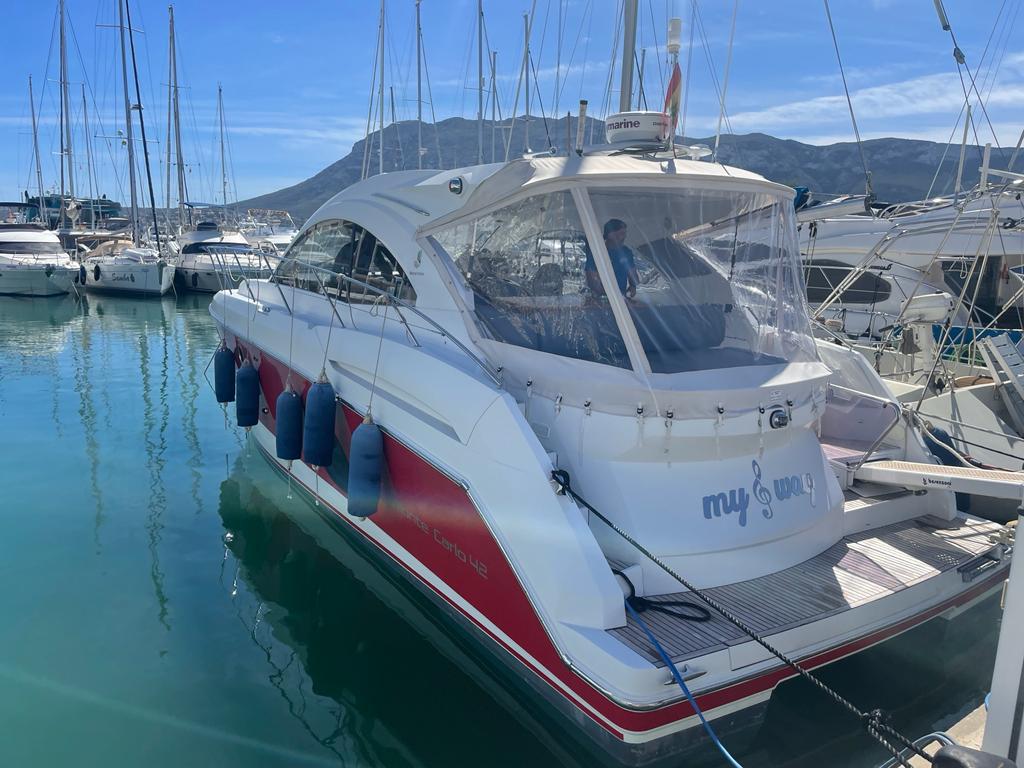 Lujoso y deportivo MONTE CARLO 42 del año 2010 con un impresionante cuidado. Bandera Española. Impuestos pagados. Servicios de motores y casco al día. Electrónica renovada (Garmin). Recomendamos visita.